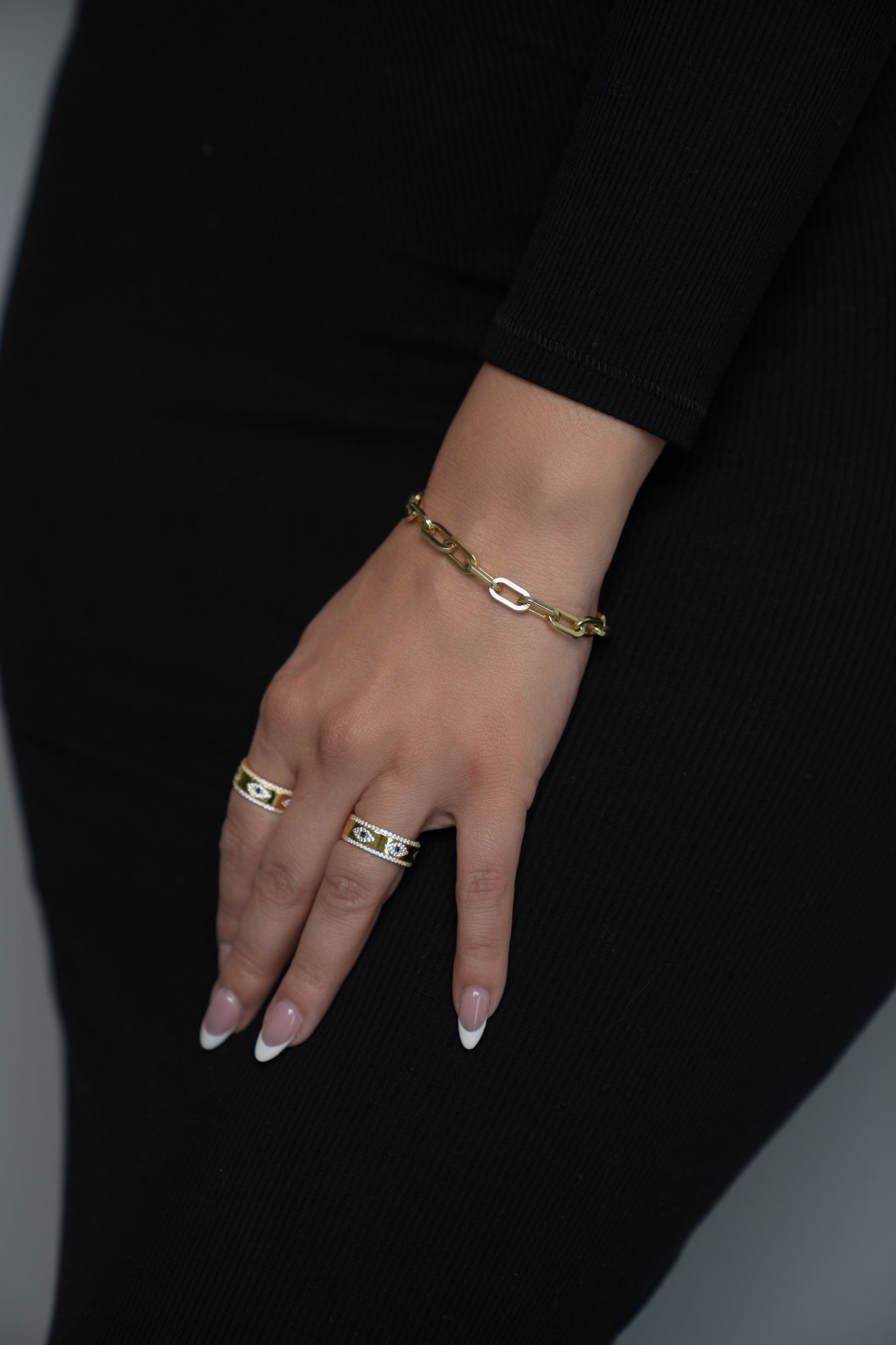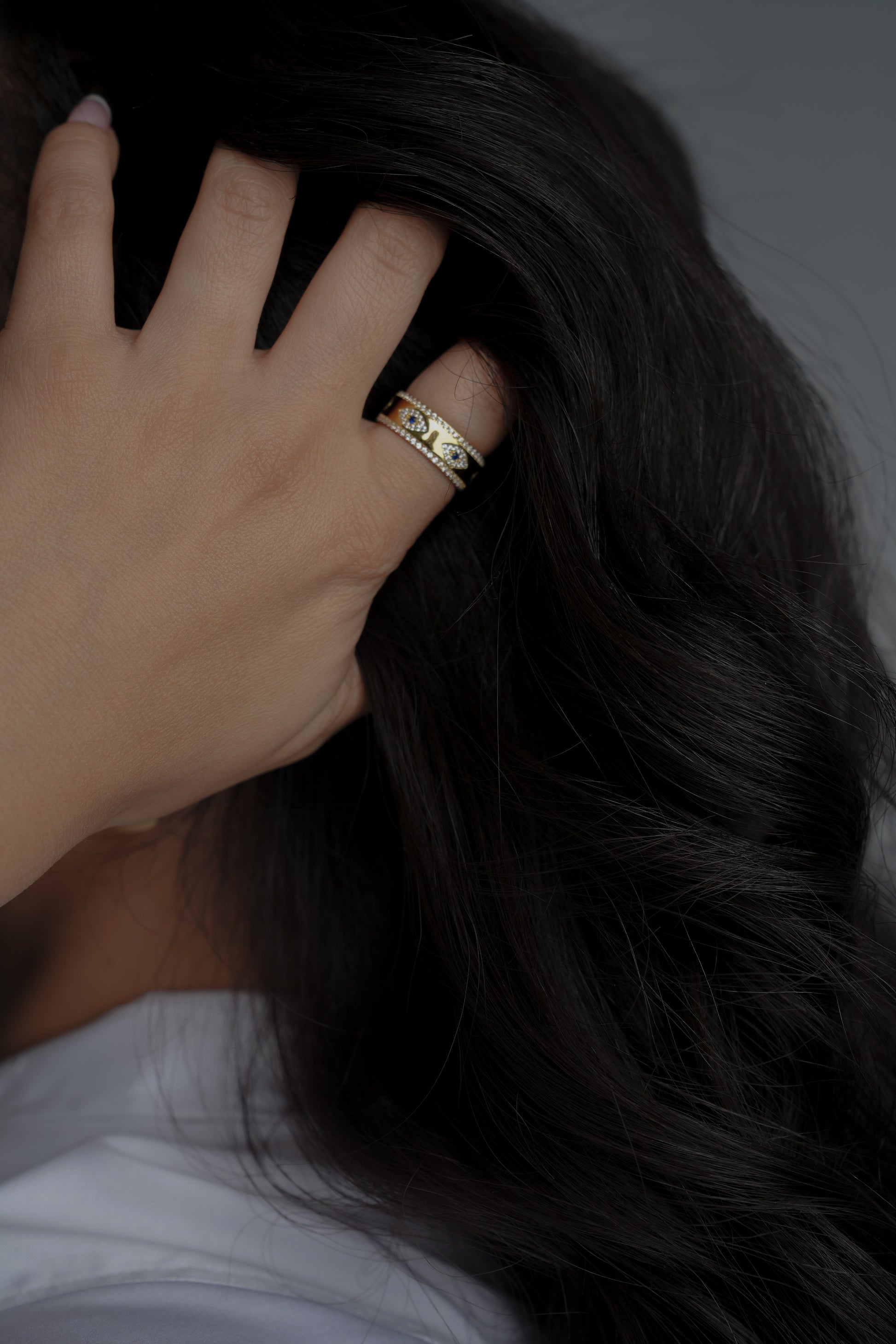 Athena is an exquisite ring featuring stunning evil eye designs adorned with sparkling cubic zirconia diamonds. Crafted with meticulous attention to detail, this ring beautifully combines elegance with meaningful symbolism representing protection. The stones enhance the allure of the evil eye motifs, adding a touch of brilliance and sophistication.