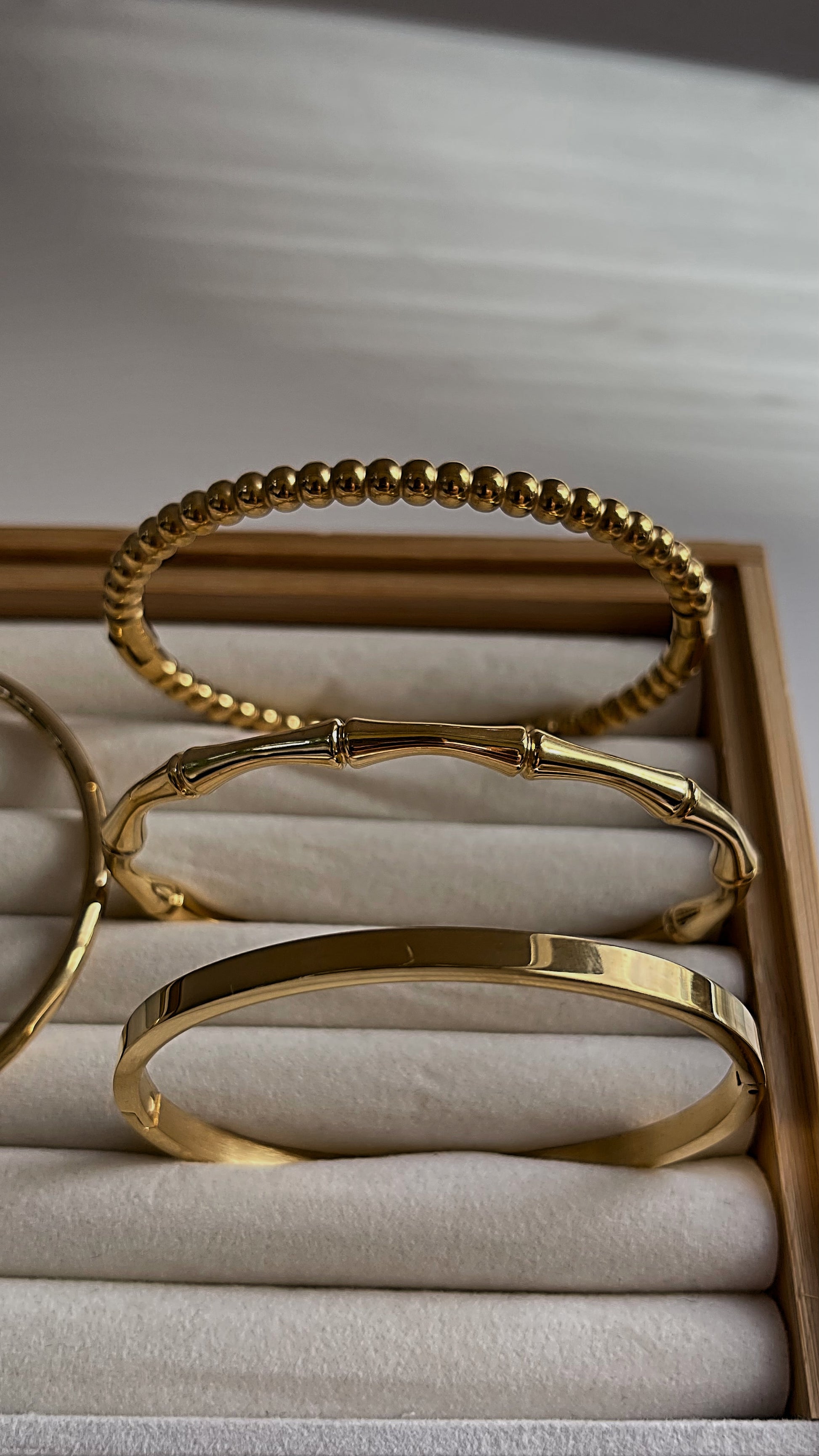 Our gold plated Diora bangle, this stunning piece is not only waterproof and non-tarnish, but also hypoallergenic and perfume resistant, ensuring long-lasting beauty and comfort. Elevate your style with this timeless and versatile addition to your collection.