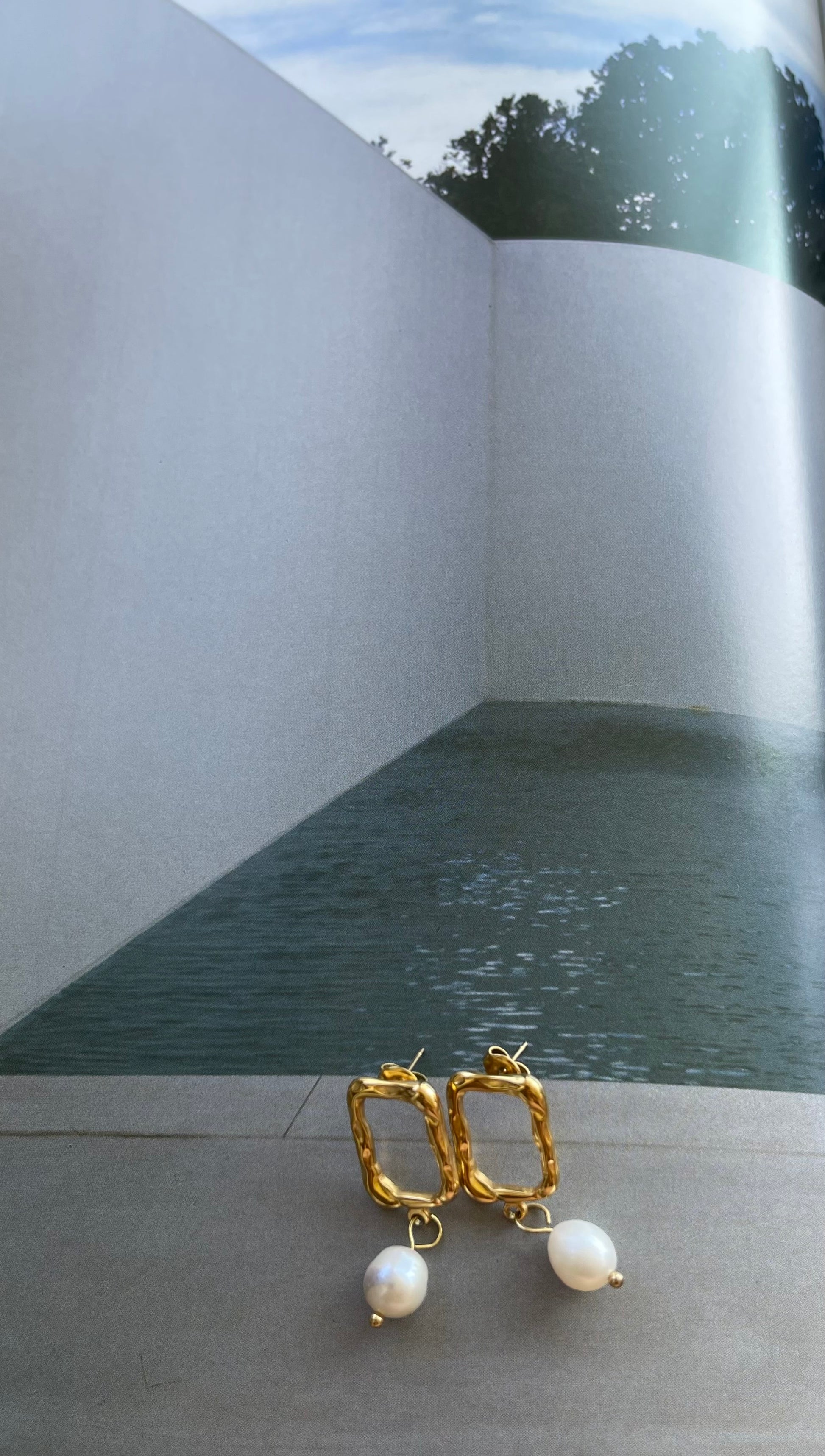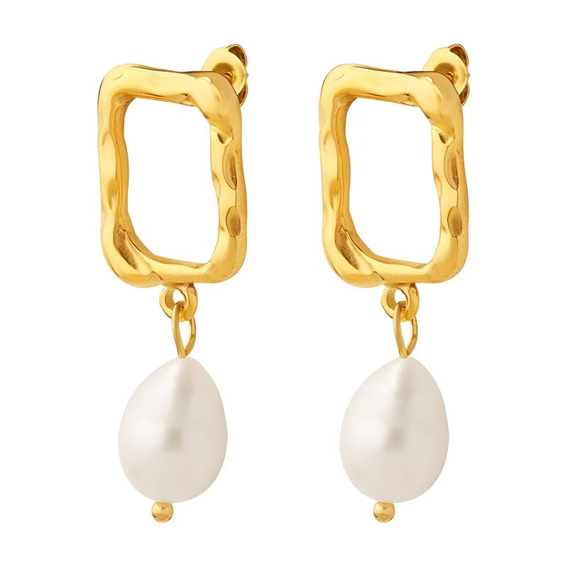 Our Alannis earrings feature a baroque natural fresh water pearl, accented by gold plating on stainless steel. Hypoallergenic and waterproof for versatile wear. Elevate your look with these elegant and timeless earrings.