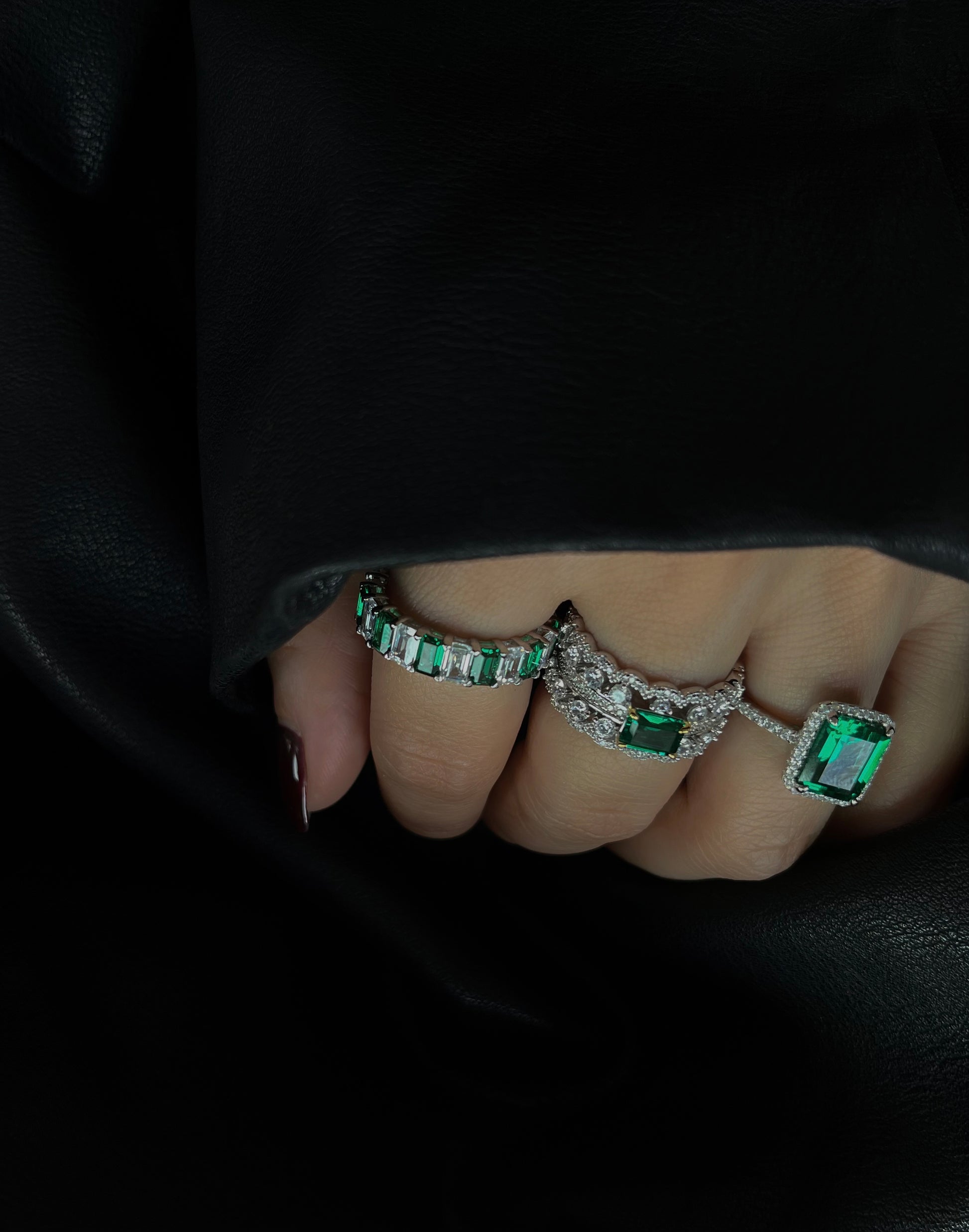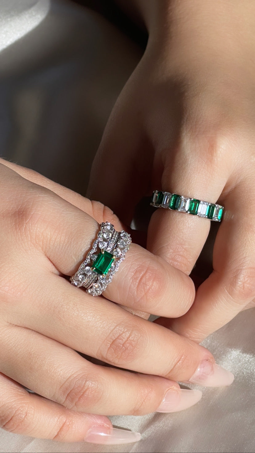 The Belle ring is a stunning three-band diamond zirconia piece featuring a striking rectangular emerald at its center. The emerald’s vibrant green hue is beautifully complemented by the surrounding bands adorned with sparkling diamonds, creating a luxurious and eye-catching design.