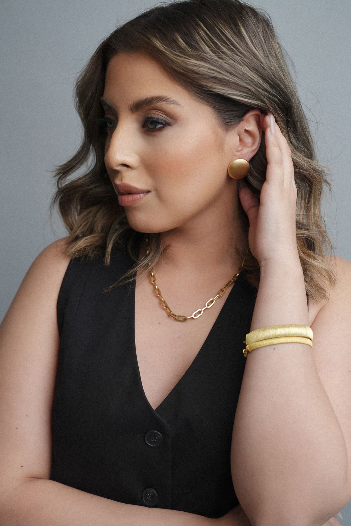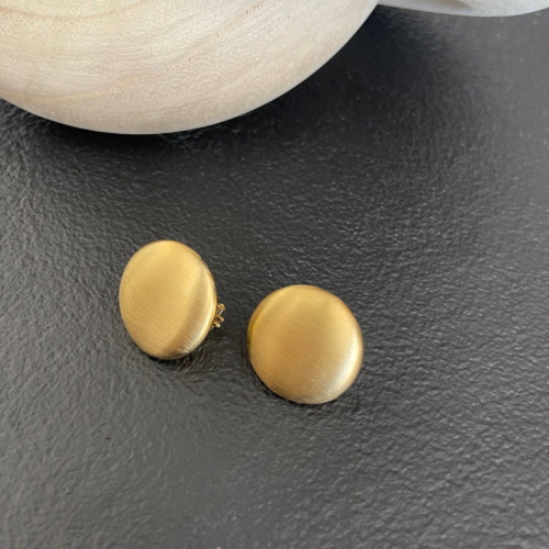 Indulge in sophistication and luxury with the Caleena earrings. Crafted from sterling silver and gold plated with a stunning matte finish, these bold and minimalist earrings are the perfect combination of elegance and simplicity. Elevate any ensemble with the flat and luxurious design of the Caleena earrings.