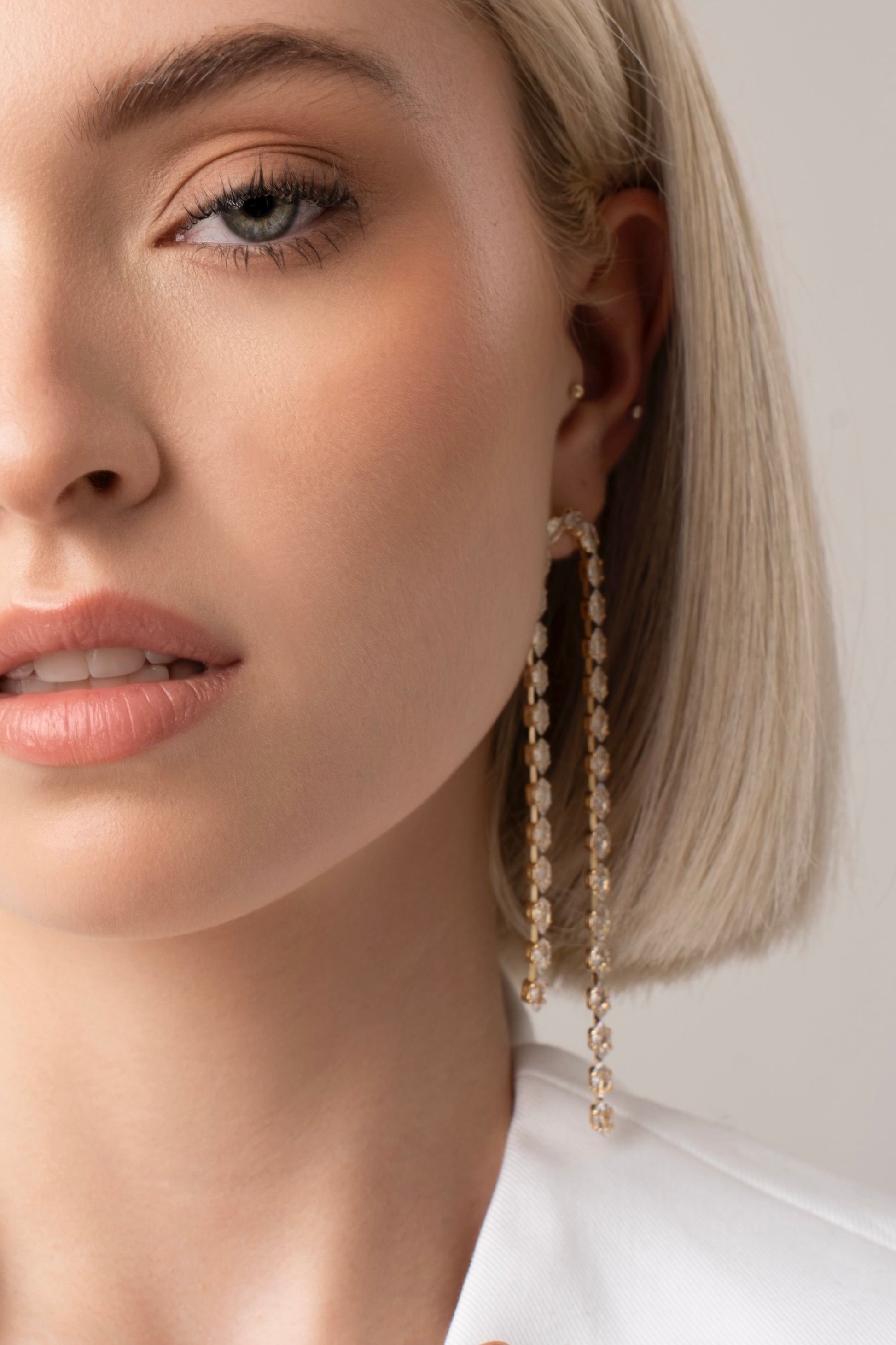 A statement in elegance. Our Ethereal Earrings feature twin strands of meticulously handset AAA zirconia crystals that drape gracefully from a curved arch, catching the light with every movement. Their elongated silhouette adds effortless glamour, balancing modern sophistication with timeless charm. Designed to elevate both evening wear and minimalist looks alike.