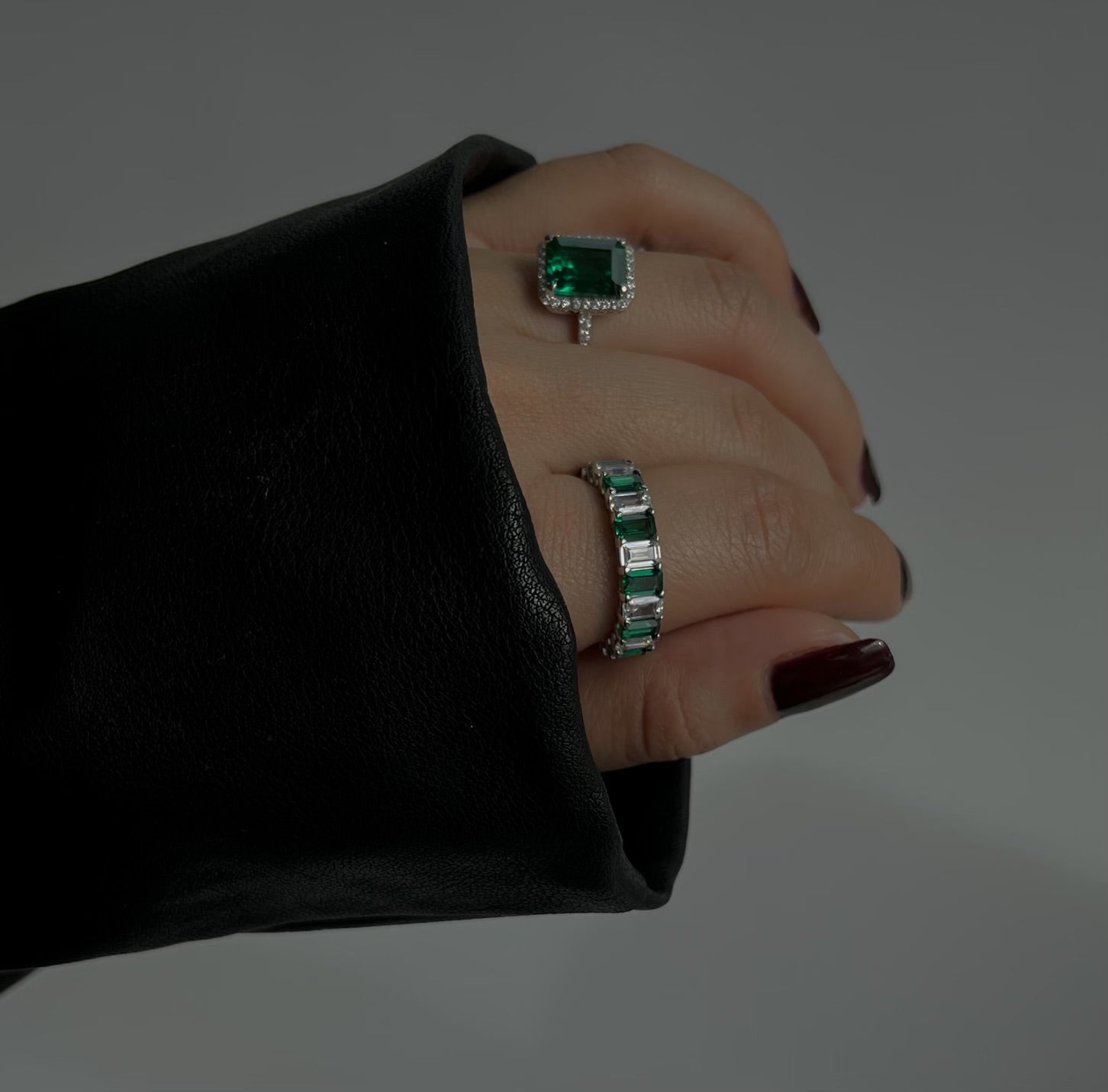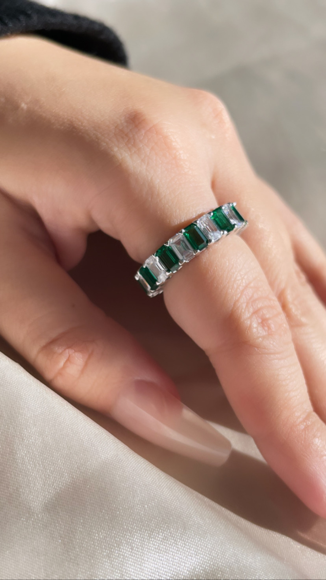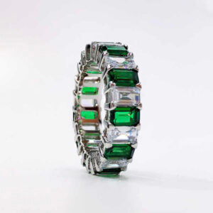 Fari ring, a luxurious piece crafted from 925 sterling silver. Hand set with AAA cubic zirconia stones and stunning green emerald cut stones, this ring exudes elegance and sophistication. Adorn yourself with the finest quality and make a statement that will leave others in envy.