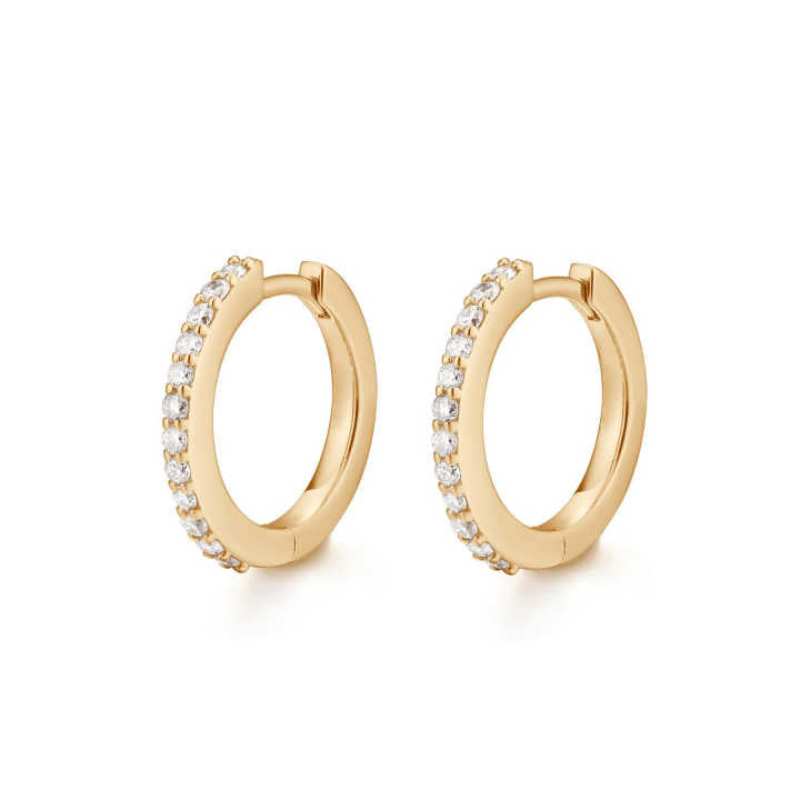 Gia a pair of elegant pave huggie hoops beautifully adorned with stones set along the band, creating a subtle yet striking sparkle. Perfect for everyday wear or special occasions , they add a touch of glamour to any outfit. Their compact size makes them versatile and easy to layer with other earrings, making them a timeless addition to your jewelry collection.