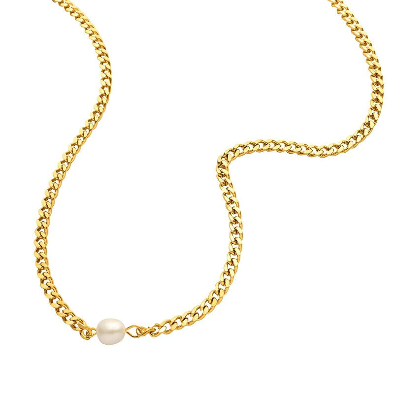 Riona our luxurious gold plated chain necklace, featuring a natural fresh water pearl. Hypoallergenic and waterproof, this elegant piece is non-tarnish and designed to add a touch of sophistication to any outfit.