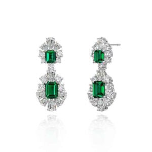 The Grace earrings feature two stunning emerald stones at their center, beautifully surrounded by a halo of sparkling diamonds. This elegant design creates a captivating contrast between the rich green of the emeralds and the brilliance of the diamond zirconia stones, making these earrings a statement piece for any formal occasion. Our Grace earrings exude sophistication and perfect for adding a touch of luxury.